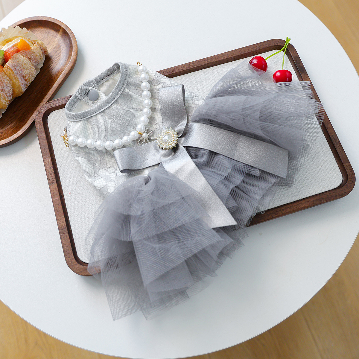 Elegant Gray Lace Pet Tutu Dress | Luxury Pearl & Rhinestone Pet Party Outfit for Small Dogs & Cats